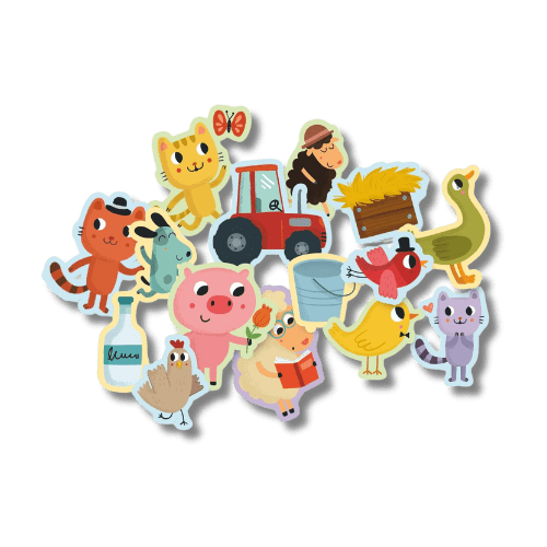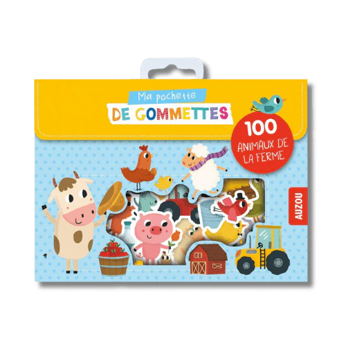 Une petite pochette contenant 100 gommettes repositionnables autour des animaux de la ferme.