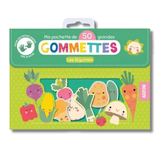 Une pochette de 50 grandes gommettes repositionnables sur le thème des légumes, pour jouer au marché ! Grâce à la languette, elles se décollent facilement pour les petites mains. Très grandes (7 cm). Dès 18 mois. Caractéristiques : 50 gommettes, Taille moyenne des gommettes : 4cm
