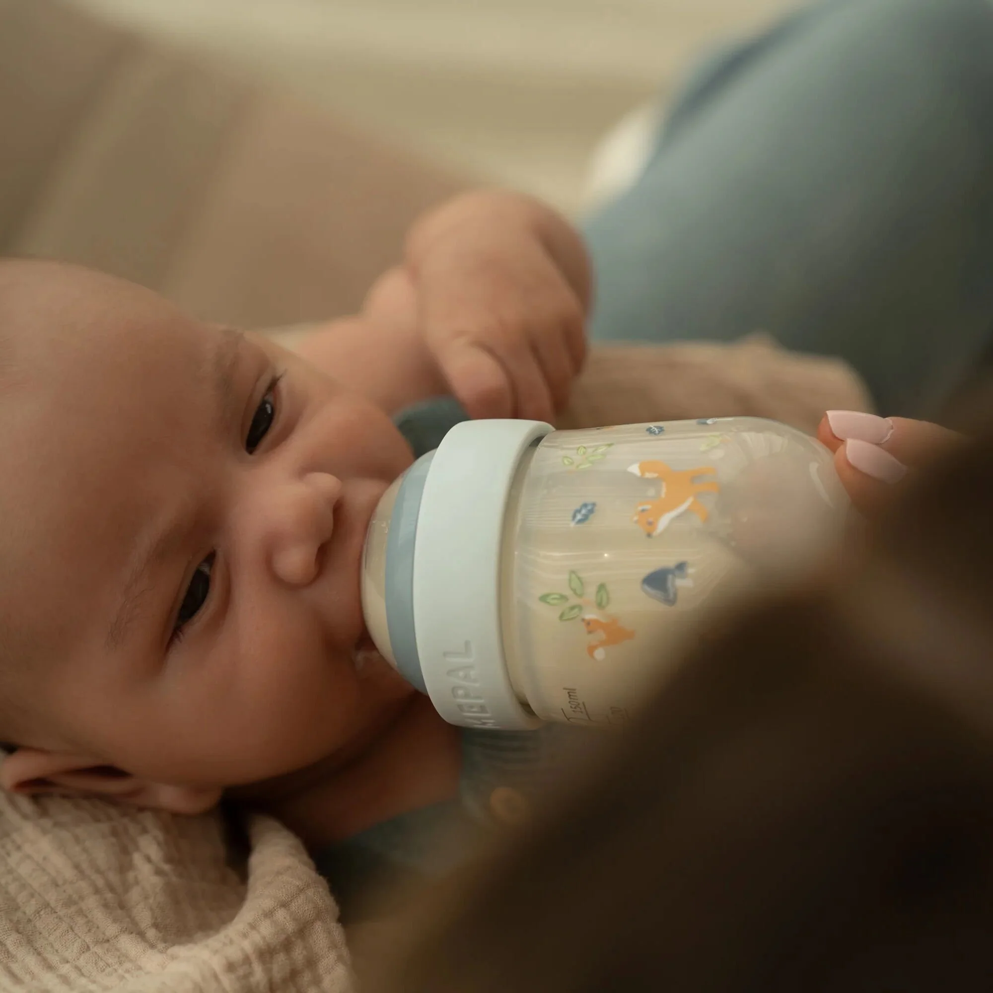 Een fijn begin voor elke voedmoment. De Mepal Mio babyfles van 165 ml, met de lieve Forest Friends print van Little Dutch, combineert comfort met gebruiksgemak. Dankzij het ergonomische ontwerp ligt de fles prettig in de hand en zorgt de zachte siliconen speen voor een natuurlijke drinkervaring. De fles is BPA-vrij, lekdicht en wordt geleverd met een antikrampjesventiel dat lucht uit het buikje van je baby weghoudt. Zo drinkt je kleintje rustig, zonder vervelende krampjes. Het spiraalontwerp in de speen voorkomt verstoppingen en zorgt voor een soepele doorstroming. De brede hals maakt het vullen en schoonmaken extra makkelijk. Na gebruik mag de fles gewoon in de vaatwasser. En dankzij de transparante afsluitdop neem je de fles hygiënisch mee voor onderweg.