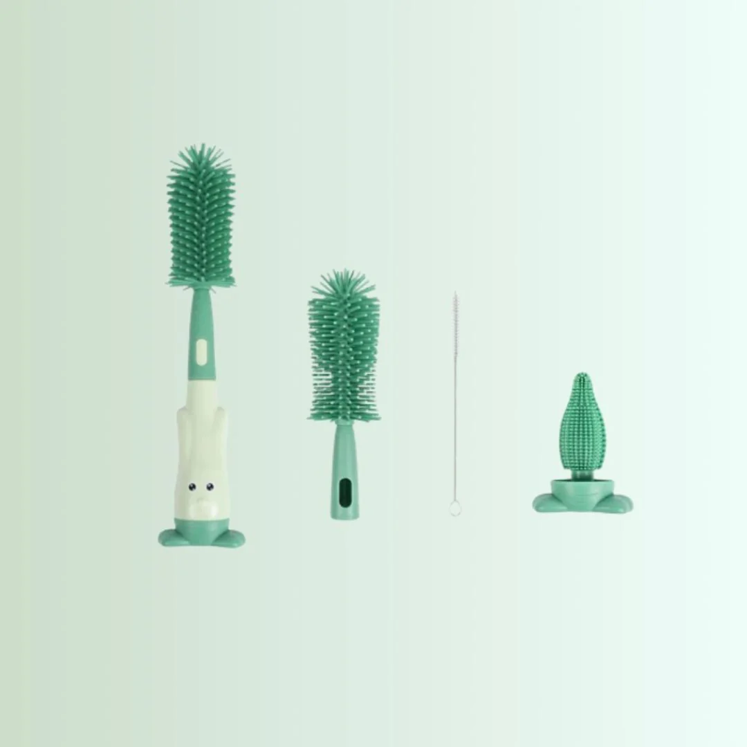 1 brosse de nettoyage pour biberon déclinable sous différentes façons avec 2 brosses de nettoyage ainsi qu’une fine brosse souple idéale pour un lavage en profondeur