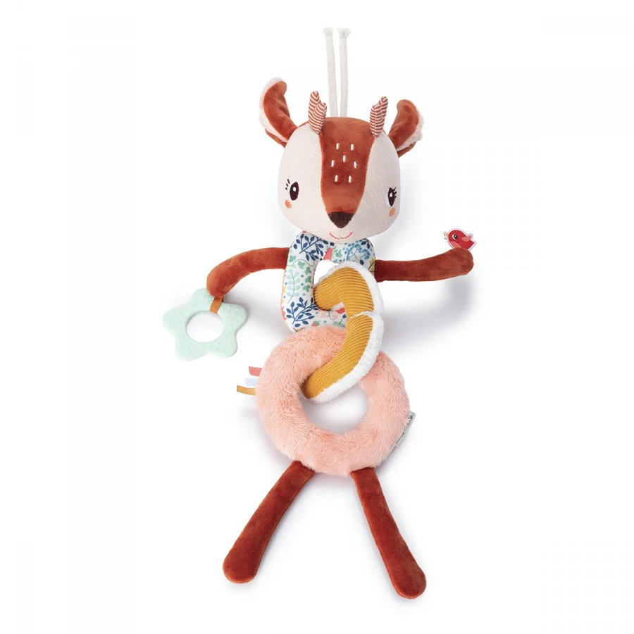 Cette chaîne souple comporte une multitude d’activités pour stimuler les sens de votre petit bout. Des bruits de cliquetis ou de crépitement, des matières variées, un anneau de dentition… autant d’éléments qui encouragent les tout-petits à explorer. Les anneaux de la chaîne sont détachables. Facile à attacher grâce à la ficelle prévue à cet effet.