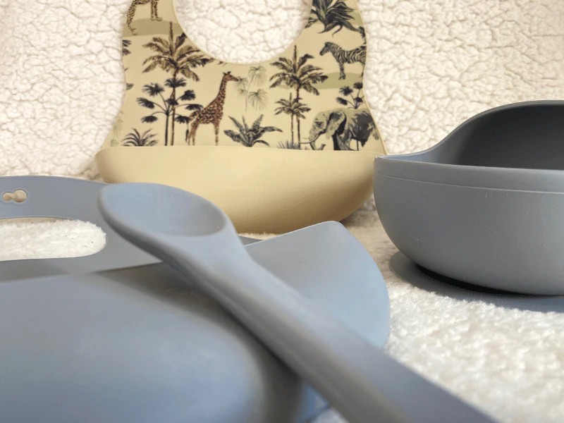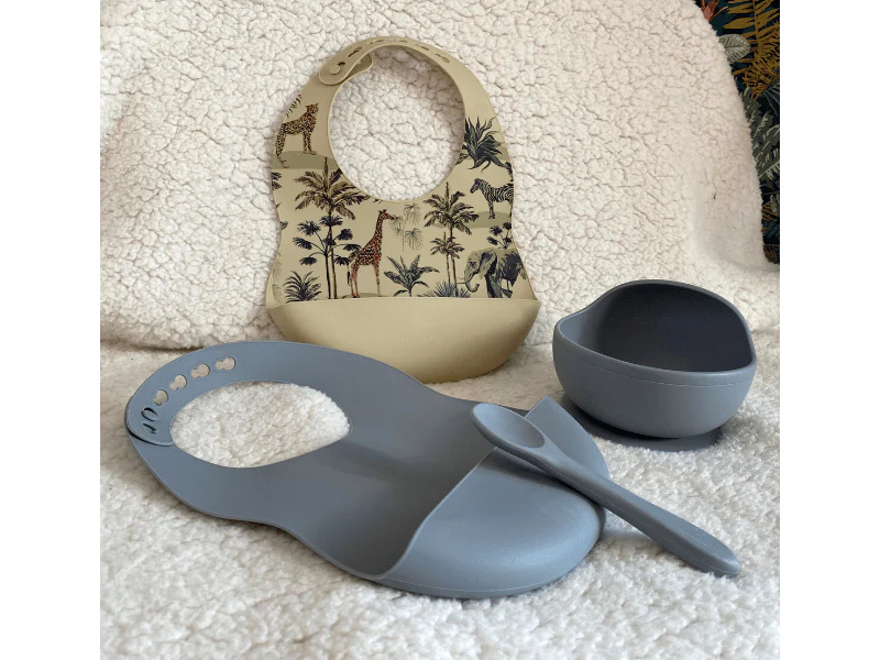 Coffret repas silicone jungle (bol, cuillère et 2 bavoirs) – Gris