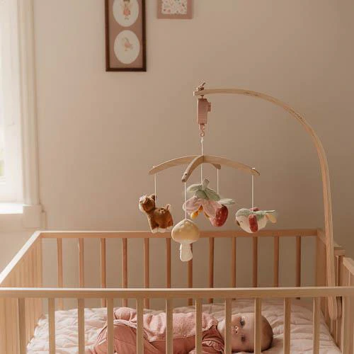 Volg het geluid en kijk hoe het hertje en het vogeltje ronddraaien. Deze mooie houten muziekmobiel werkt rustgevend voor baby’s dankzij het lieve slaapliedje. Aan de mobiel hangen vijf speeltjes uit de Fairy Garden collectie: een hertje, aardbei, bloem, paddenstoel en vogel. Baby’s kijken graag naar de beweging van deze speeltjes, wat hun visuele ontwikkeling stimuleert. De muziekmobiel is geschikt vanaf de geboorte en eenvoudig te bevestigen aan het kinderbed of de box. WAARSCHUWING Bevestig dit speelgoed buiten het bereik van het kind. Om mogelijke verwondingen door verstrikking te voorkomen, verwijder dit speelgoed wanneer het kind begint te proberen op handen en knieën te gaan zitten. Montage door een volwassene vereist.