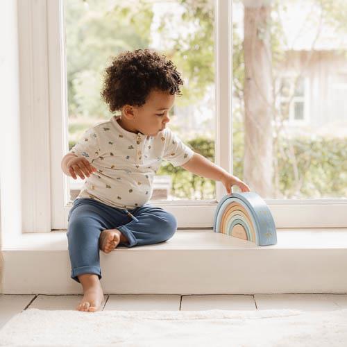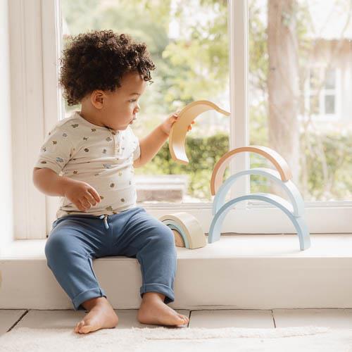 Stapel, sorteer en bouw! Met deze regenboogstapelaar in de tinten blauw, geel en groen zijn er talloze creatieve manieren om te spelen. Gebruik hem niet alleen om een regenboog te bouwen, maar ook om sculpturen te maken of tunnels te creëren voor treinen en auto’s. Laat je fantasie de vrije loop en ontdek eindeloze ideeën om met de bogen te spelen. Deze houten regenboogstapelaar stimuleert fantasierijk spel en bevordert de fijne motoriek. Je zult versteld staan van de veelzijdigheid van dit speelgoed én hoe prachtig het staat in de kinderkamer.