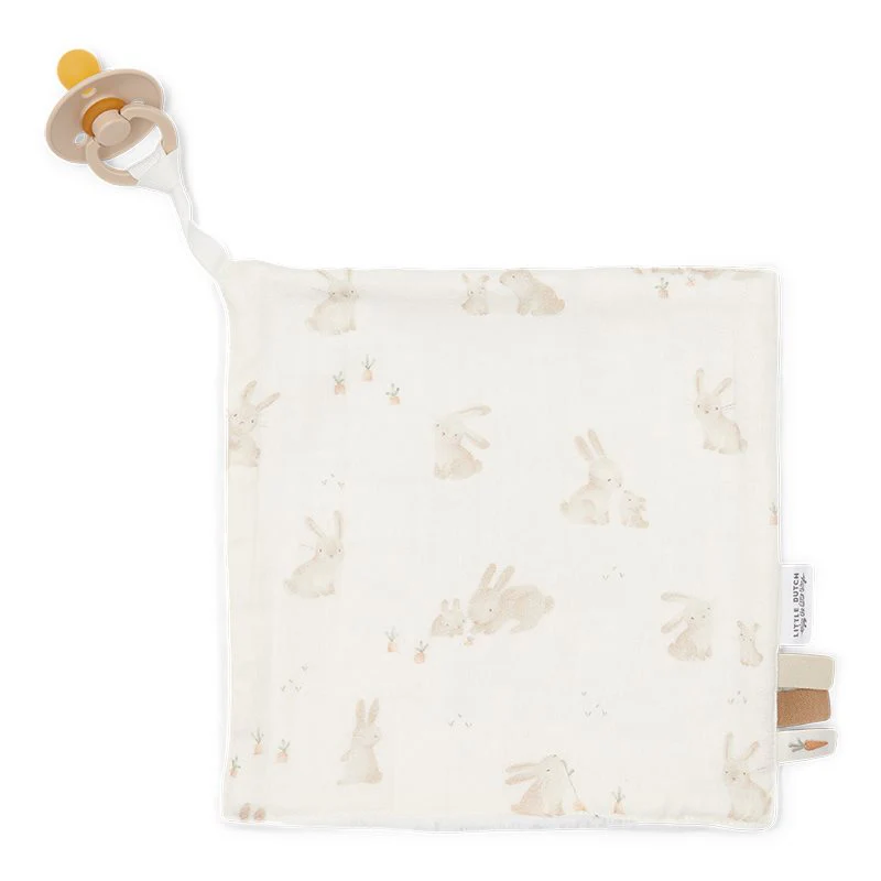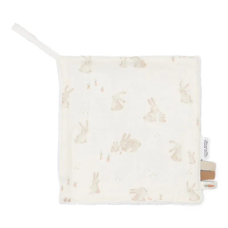 Deze knuffeldoek hydrofiel Baby Bunny van Little Dutch is gemaakt van biologisch katoen en is Oeko-Tex gecertificeerd. De voorkant van het doekje is gemaakt van een voorgewassen hydrofiele stof en de achterkant van een zachte fleece stof. Hierdoor zijn beide kanten heerlijk zacht. Perfect als speen-, speel- of troostdoek voor je baby of peuter. Aan het lusje van de knuffeldoek kun je een speen- of bijtring bevestigen. De knuffeldoek is 20 x 20 cm.