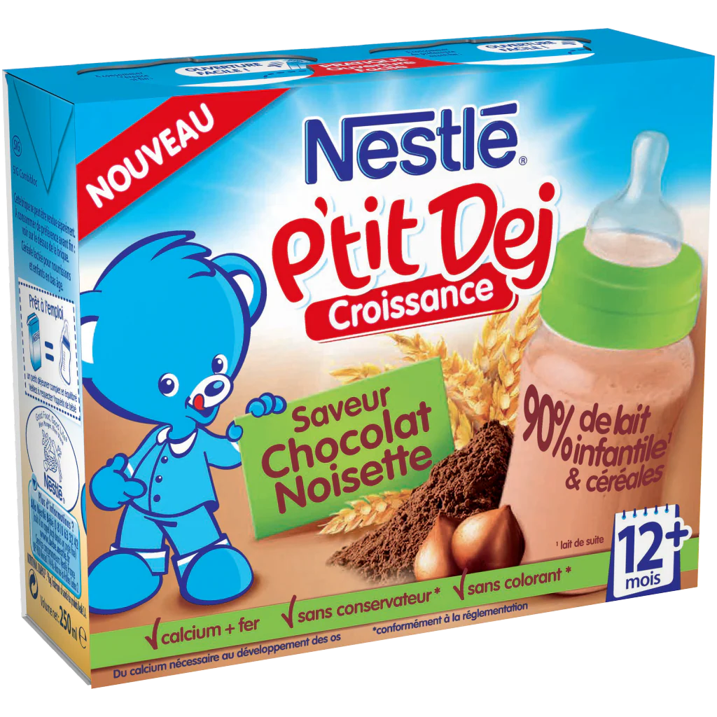 NESTLÉ P’tit Dej est un délicieux petit-déjeuner complet et équilibré conçu exprès pour votre bébé* : 90% de lait infantile (1), la juste dose de céréales et un bon goût de chocolat et de noisette pour éveiller ses papilles dès le matin.