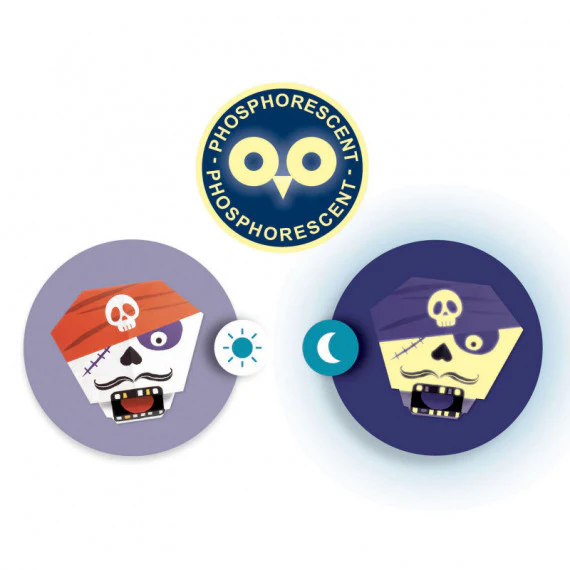 Pour jouer à se faire peur, les personnages une fois pliés apparaissent dans le noir grâce à l’encre phosphorescente !