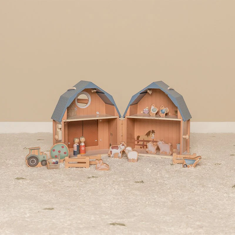 Met dit speelhuis in de vorm van een schuur dat op de boerderij staat gaat jouw kleintje zoveel plezier beleven! Vouw de boerderij open en daar komen de dieren al aan. Met al deze houten speelfiguren kan jouw kindje een eigen verhaal verzinnen. Hierdoor wordt het fantasierijk denken van je kindje gestimuleerd. En ben je klaar met spelen? Dan stop je alle figuren in het huisje, vouw je hem weer dicht en berg je het speelhuisje weer netjes op. WAARSCHUWING: Niet geschikt voor kinderen jonger dan 3 jaar. Kleine onderdelen. Verstikkingsgevaar.