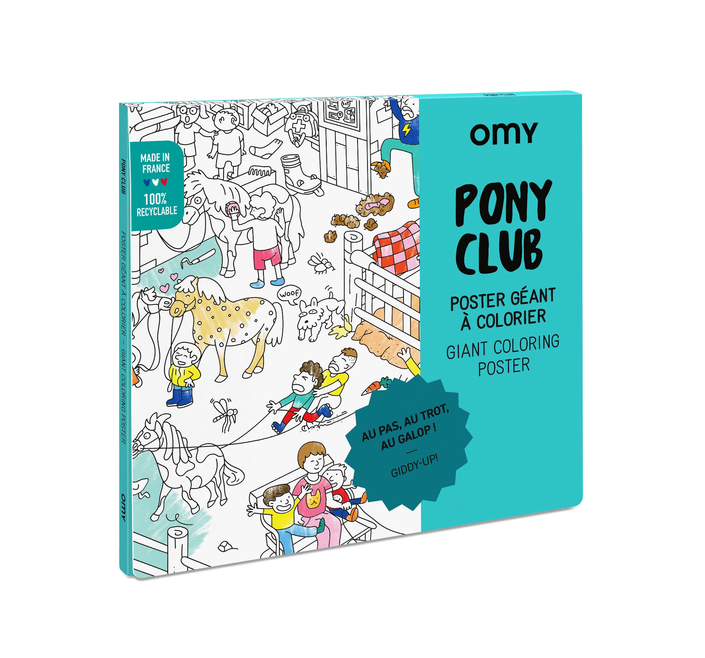 Ce poster géant a été créé pour ceux qui rêvent des chevaux et les petits cavaliers passionnés: une visite au cœur du club, la découverte des activités équestres, les soins à donner aux animaux et les exploits sportifs sur la grande carrière. Une multitude de détails à colorier avec toujours l’humour décalé d’OMY !