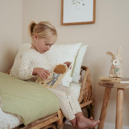 Knuffels voor het slapengaan! Deze pyjama is ontworpen met comfort en stijl in gedachten. Met een verfijnd printje van kleine blaadjes en een charmante ruche langs de sluiting combineert het schattig design met comfort. De drukknoopsluiting aan de voorkant en bij het kruis zorgt voor gemakkelijk aan- en uitkleden en luiers verschonen. Gemaakt van biologisch katoen voelt deze onesie zacht aan op de huid van je baby en staat het perfect bij het bijpassende beddengoed. Verpakt in een mooie doos, dus extra leuk om cadeau te geven. Verkrijgbaar in maten 50/56, 62/68 en 74/80.