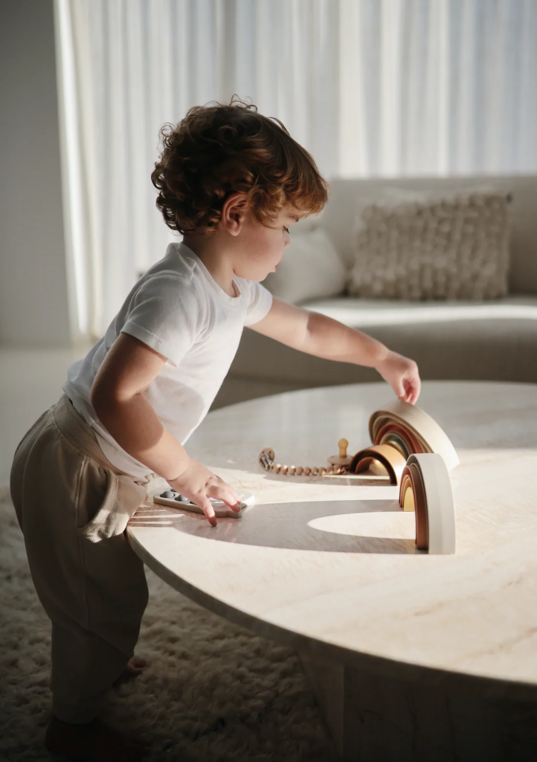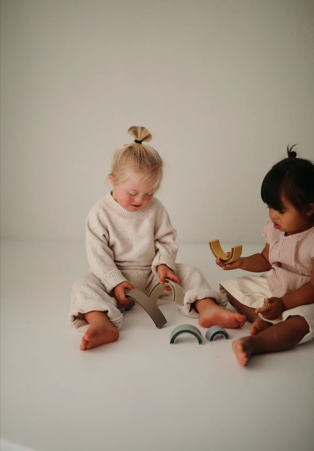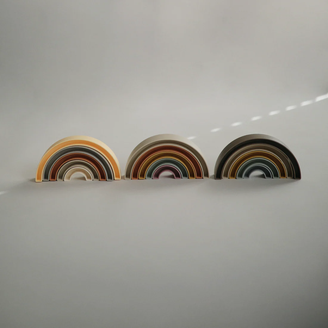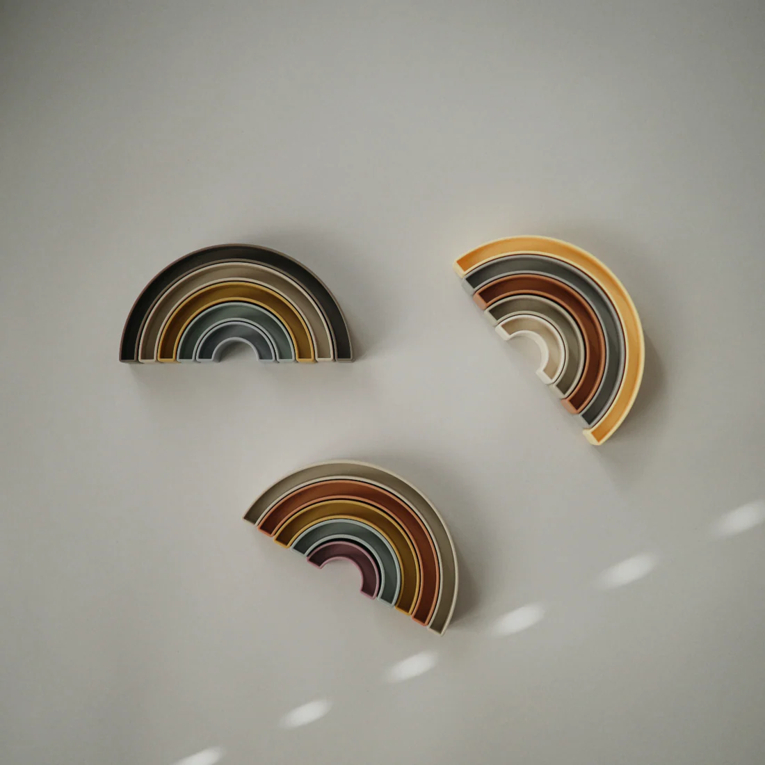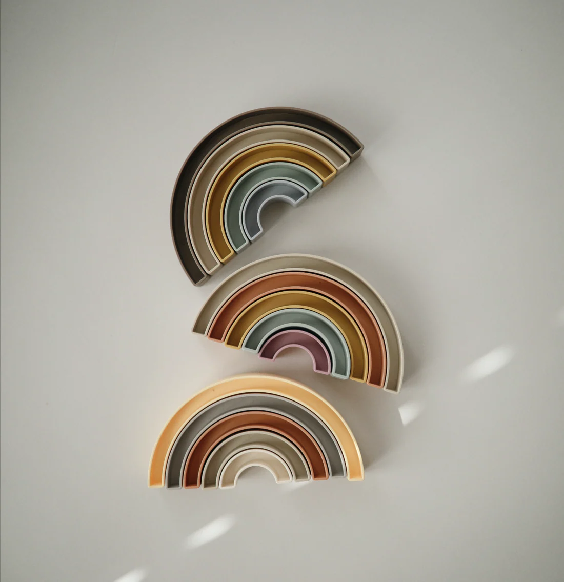 Rainbow Stacking Tower de la marque Mushie. Des couleurs pastel douces qui s’intègrent parfaitement dans votre intérieur. Les tout-petits adoreront assortir les couleurs douces tout en explorant leur motricité fine avec ce magnifique jeu à empiler en forme d’arc-en-ciel !