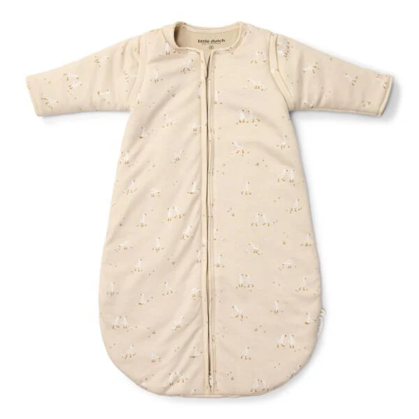 Laat je kleintje wegdromen in deze prachtige winterslaapzak met afritsbare mouwtjes in een zachte, natuurlijke tint met een subtiele Little Goose print. Hij is gemaakt van 100% biologisch katoen en voelt heerlijk zacht en luxe aan. Perfect om je baby warm te houden en die kleine ganzenprint maakt dromen nog zoeter. Slapen in stijl is nog nooit zo comfortabel geweest! De slaapzak is verkrijgbaar in de maten 60 cm, 70 cm en 90 cm. De slaapzak sluit naar beneden zodat je kindje hem niet gemakkelijk zelf kan openritsen. Er zit een flap over de rits om de gevoelige babyhuid te beschermen.