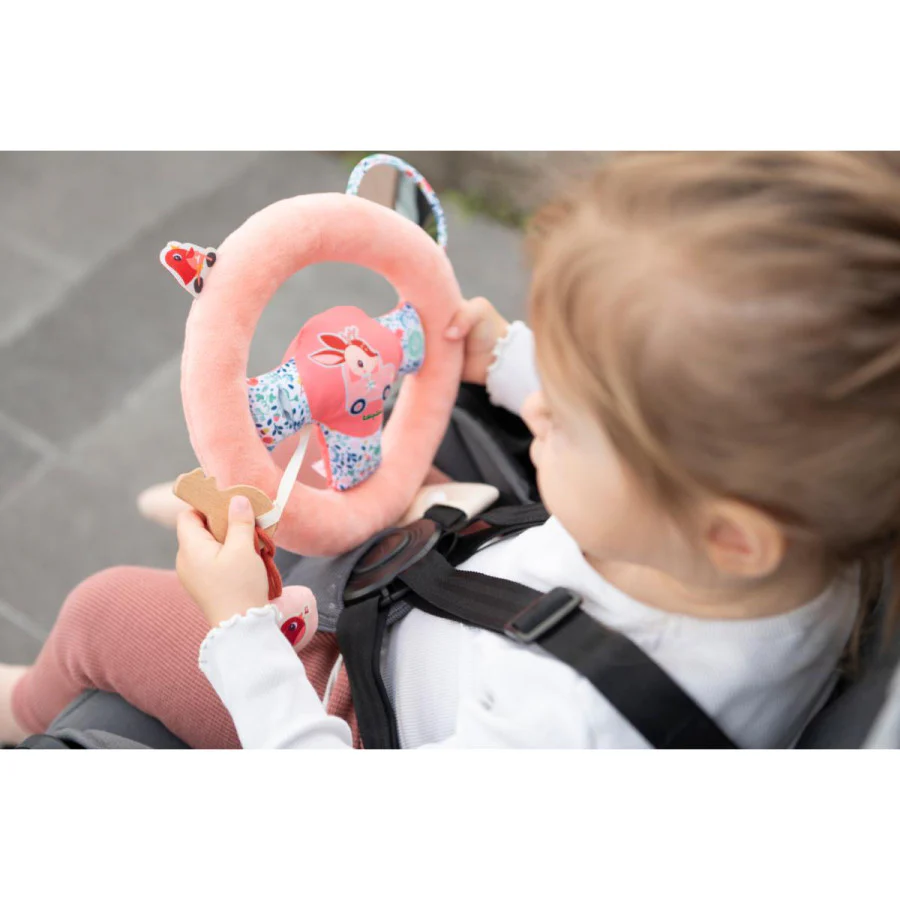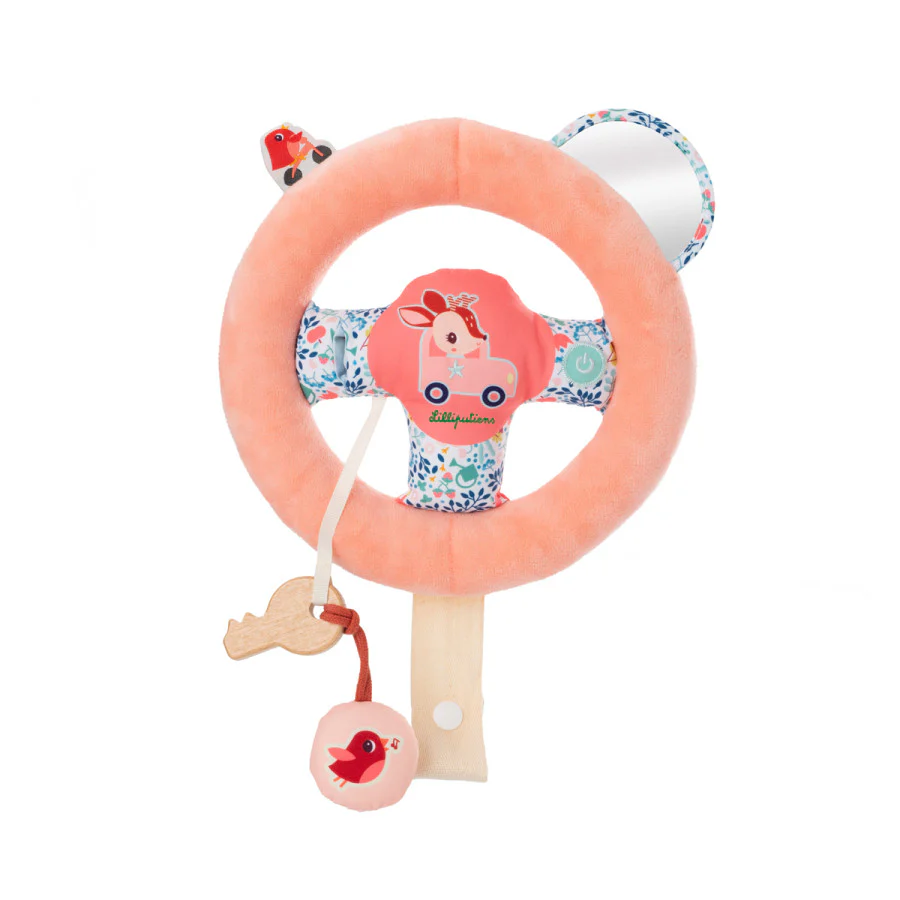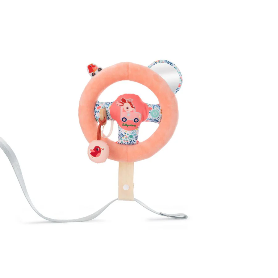 N’oubliez pas de vérifier le rétroviseur ! Le volant amovible qui se fixe à la ceinture du siège-auto est idéal pour imiter les mouvements des adultes et encourager la créativité de l’enfant.