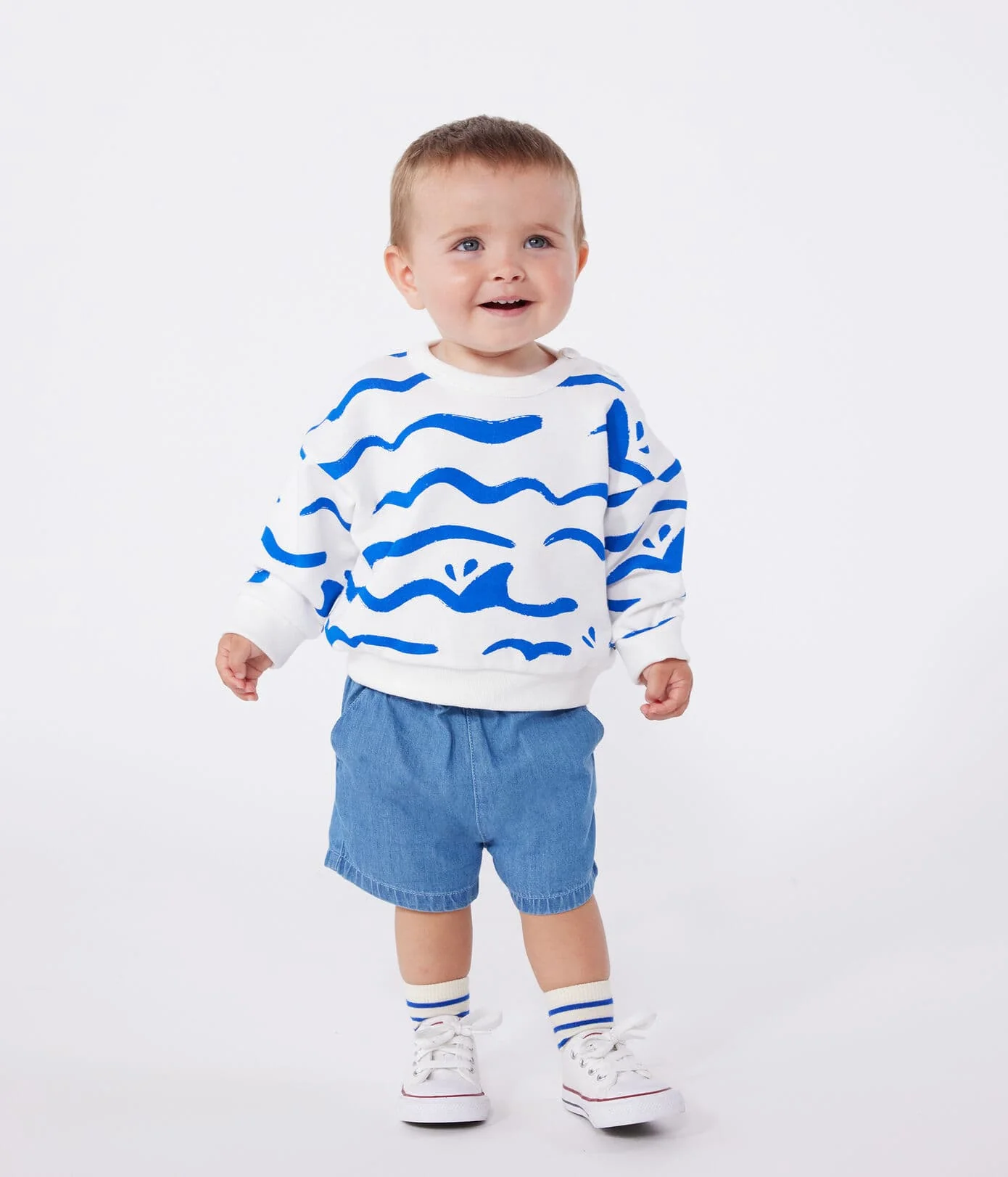 Sweatshirt garçon en molleton de Petit Bateau, une matière douce et confortable. Sweat manches longues animé d’un motif requin amusant.Ouverture boutonnée à l’encolure pour faciliter l’enfilage.Une histoire de famille : cet imprimé se retrouve sur d’autres pièces de la collection ainsi qu’à l’enfant !