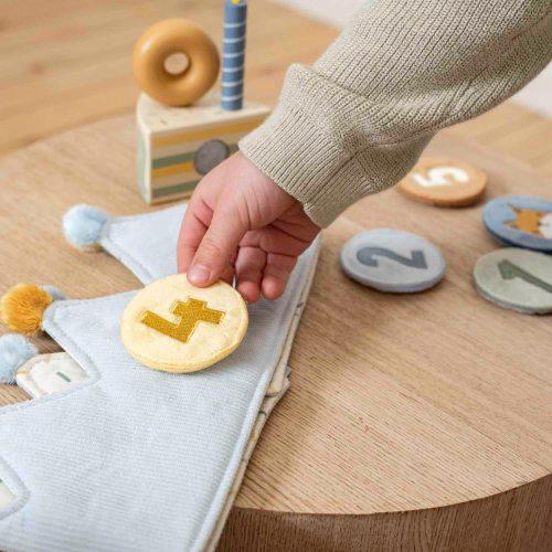 Hiep hiep hoera! Vier je verjaardag in stijl met deze schattige verjaardagskroon en strooi wat sprookjesachtige magie over jouw speciale dag. Verwissel ieder jaar het cijfer van 1 tot en met 5 zodat de kroon meegroeit met elke mijlpaal van jouw kleintje. Kies het verjaardagsnummer, zet de kroon op en leg die kostbare momenten vast! Of kies voor het embleem met het vosje wanneer jouw kleintje elke dag wel de koning of koningin van wonderland wil zijn. De kroon is gemaakt van zacht gevoerde en geribbelde stof in lichtblauw, afgewerkt met gekleurde pompons. Dankzij de klittenbandsluiting groeit de kroon mee met jouw kindje. Kijk hoe trots jouw kleintje de kroon draagt en zijn of haar leeftijd toont met elke glimlach en giechel. Fijne verjaardag!